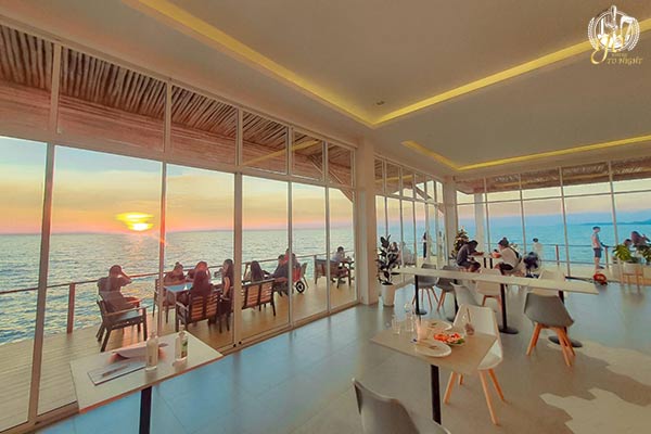 ส่วนภายในร้าน “Charome Café” จะเป็นร้านกระจกใสปรับอากาศโมเดิร์นเรียบง่ายมีพื้นที่กว้างขวางสำหรับการจัดวางโต๊ะนั่งรองรับลูกค้าในโทนสีครีมอ่อนละมุนเหมือนคาเฟ่ในเกาหลี สามารถมองเห็นทะเลและทิวเขาที่อยู่บริเวณใกล้เคียงได้แบบ 360 องศาเลย เมื่อแสงอาทิตย์ยามเย็นสาดส่องเข้ามาก็จะทำให้ผนังในร้านบริเวณบาร์เป็นสีออกชมพูเหมือนอยู่ในบาร์ริมหาดฮาวายมาก ๆ ไม่ต้องมีสปอตไลต์ปรับแต่งผนังใด ๆ ทั้งสิ้น ถือว่าคนออกแบบเลือกทำเลและจุดการออกแบบภายในได้อย่างมีความละเอียดละออสุด ๆ และอีกโซนก็จะเป็นห้องพักติดริมทะเลให้อารมณ์เหมือนอยู่มัลดีฟเลย