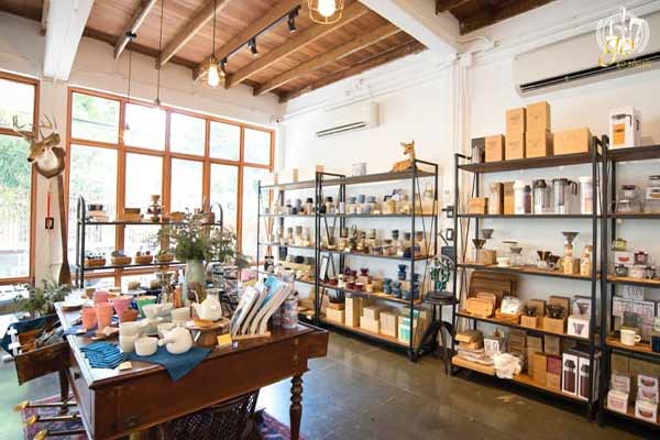 “Blue Dye Café” เป็นคาเฟ่ร้านอาหารกึ่งร้านขายเซรามิกรายใหญ่ที่ออกแบบแกลอรี่เล็ก ๆ ที่มีกลิ่นอายของอาหารกับกาแฟสุดละมุนในบ้านขนาดกะทัดรัดใจกลางกรุงเทพมหานคร ย่านสุขุมวิท – ทองหล่อ ซึ่งหากคุณได้มีโอกาสเข้ามาที่ร้านนี้แล้วก็จะพบกับร้านที่ตกแต่งสไตล์เจแปนฮิป ๆ แบบมินิมอล บรรยากาศเงียบสงบเป็นกันเอง ซึ่งนอกจากจะมีการเสิร์ฟกาแฟกับอาหารฟิวชั่นสูตรเด็ดแล้ว คุณก็ยังสามารถเดินเลือกซื้ออุปกรณ์เซรามิกหลากหลายแขนงในแบรนด์ของ “Cone No.9” ได้ ไม่ว่าจะเป็นอุปกรณ์เซรามิกด้านกาแฟ แก้ว ชาม จาน และอื่น ๆ มากมายที่มีหลากหลายสไตล์ลวดลายให้คุณได้เลือกชมเลือกซื้อ หากมองดูดี ๆ ก็เหมือนบ้านของตัวละครหนุ่มหล่อ F4 เกาหลี “โซอีจอง” จากในซีรีย์เรื่อง “Boys Over Flowers (2009)”เลยนะเนี่ย