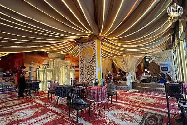 “โอม คาเฟ่” ตัวคาเฟ่จะเป็นห้องขนาดใหญ่อยู่บริเวณชั้น 1 คอนโด Whizdom Station Ratchada-Thapra ซึ่งภายในตกแต่งในธีมอบอุ่นด้วยแสงไฟสีส้มซึ่งทั่วพื้นจะถูกปูด้วยพรมแดงลวดลายสวยงามมีทางเดินกว้างขวางโดดเด่นตั้งแต่เห็นจากประตูกระจกภายนอกจนคิดว่ามีงานเทศกาลใด ๆ หรือเปล่า ซึ่งที่นั่งในคาเฟ่จะแบ่งออกเป็นซุ้ม ๆ ให้นั่งกับพื้นผมท่ามกลางหมอนอิงและหมอนต่าง ๆ ที่มีลวดลายปักเลอค่างานดีตามวัฒนธรรมอินเดียสุดหรูหราและมีโต๊ะสำหรับเสิร์ฟอาหารด้วย โดยซุ้มแต่ละซุ้มจะมีการกั้นความเป็นส่วนตัวของลูกค้าด้วยผ้าม่านยาวระย้าที่ทำให้รู้สึกเหมือนตัวเองกำลังนั่งอยู่บนที่นอนอินเดียแล้วรอคนมาเสิร์ฟของว่างมาก ส่วนโต๊ะนั่งแบบโมเดิร์นจะมีแบบจำกัด ซึ่งแต่ละมุมก็จะเป็นฉากพร็อพถ่ายรูปแนวอินเดียสวย ๆ ที่ต้องมาสัมผัสด้วยตาคุณเอง หรือใครจะไหว้พระพิฆเนศก็ได้