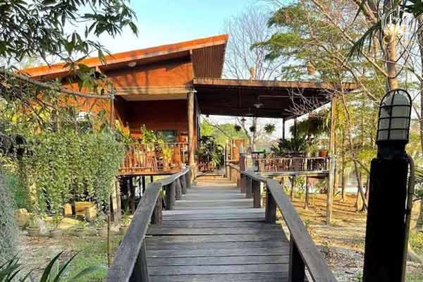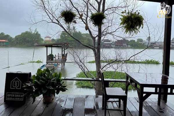 ตัวคาเฟ่เป็นลักษณะบ้านไม้ชั้นเดียวหลังเล็กๆ ยกพื้นสูง มีชานระเบียงหน้าบ้านเปิดโล่งเหมือนทรงบ้านที่นิยมในยุคก่อนๆ เฟอร์นิเจอร์ที่ใช้ส่วนใหญ่จะเป็นวัสดุที่ทำมาจากไม้ รวมไปถึงเครื่องเรือนแบบเก่าที่ยังคงความสวยคลาสสิคไม่เปลี่ยนแปลง นอกจากนี้รอบบริเวณยังแวดล้อมไปด้วยต้นไม้น้อยใหญ่ ทำให้บรรยากาศดูร่มรื่น สบายๆ อบอุ่นและเป็นกันเอง สำหรับมุมที่นั่งจะมีให้เลือกได้ทั้งแบบ Indoor และ Outdoor โดยโซนด้านในจะเป็นแบบโอเพ่นแอร์นะคะ แต่รับรองได้เลยว่าอากาศไม่ร้อน เพราะอยู่ติดริมแม่น้ำจะมีลมจากแม่น้ำพัดมาเอื่อยๆ รวมทั้งผนังเกือบทุกด้านยังมีหน้าต่างเปิดทำให้อากาศถ่ายเทได้สะดวก นอกจากนี้ยังีประตูกระจกบานใหญ่ ที่เปิดรับลมแม่น้ำได้อย่างเต็มที่ หรือใครอยากออกไปนั่งเล่นห้อยขานอกชานพร้อมชมวิวแม่น้ำไปด้วยก็ยังได้ ซึ่งต้องบอกก่อนว่าเวลาเดินเข้ามาภายในร้านอารมณ์จะคล้ายเดินเข้ามานั่งในห้องรับแขกของบ้านหลังหนึ่งเลยทีเดียว ส่วนโซนด้านนอกก็น่าสนใจไม่แพ้กัน โดยเฉพาะศาลาริมน้ำที่มีสะพานทอดยาวตั้งแต่ตัวบ้านจนถึงศาลา เป็นอีกมุมหนึ่งที่เชื่อแน่ว่าใครแวะมาที่นี่คงอดใจจะเดินข้ามไปชมวิวทิวทัศน์ไม่ได้อย่างแน่นอน