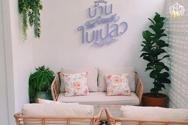ภายในร้านตกแต่งออกแบบให้เป็นโทนสีขาวดูสะอาดตา โต๊ะให้เลือกนั่งได้หลากหลายมุมทั้งด้านนอกและด้านใน เมื่อเข้ามาด้านในสิ่งที่สะดุดตามากที่สุดก็คือเคาเตอร์สีม่วงที่ตั้งอยู่กลางร้านนั่นเองค่ะ นอกจากนี้ตามมุมต่างๆ ยังประดับด้วยดอกไม้ประดิษฐ์ จัดช่อใส่แจกันวางไว้อย่างสวยงาม บ้านใบเปลว คาเฟ่ พึ่งเปิดให้บริการมาไม่นาน แต่ออเดอร์ในการสั่งซื้อถล่มทลาย เพราะปัจจุบันขนมไทยรสชาติดีๆ เริ่มหาทานได้ยากขึ้นเรื่อยๆ หาคนรุ่นใหม่ที่จะมาสานตอนวิธีการทำได้น้อยมาก เนื่องจากต้องพิถีพิถันกันทุกขั้นตอน กว่าจะทำเสร็จแต่ละอย่างต้องใช้เวลาพอสมควร ทำให้คนยุคใหม่ที่มักชอบอะไรเร็วๆ สะดวกสบาย ไม่นิยมเรียนทำขนมไทยกันเท่าไหร่นัก