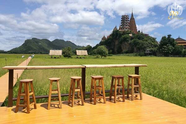 คาเฟ่ในจังหวัดกาญจนบุรี ต้องบอกก่อนว่าในจังหวัดกาญจนบุรีมีคาเฟ่ริมทุ่งเกิดขึ้นหลายแห่ง และแต่ละแห่งรูปแบบร้านจะแตกต่างกันออกไปที่เหมือนกันก็คือวิวทุ่งนานั่นเอง สำหรับรักษ์คันนา คาเฟ่ นอกจากคุณจะเห็นวิวของทุ่งได้อย่างชัดเจน ยังมองเห็นวิวของวัดถ้ำเสือได้อีกด้วย ใครจะแวะไปเที่ยววัดก่อนมาแวะคาเฟ่ก็ได้เช่นกัน ภายในร้านมีโซนให้เลือกนั่ง นั่งชิลชิล ได้หลายโซน ซึ่งจะเป็นแบบโอเพ่นแอร์ทั้งหมด แต่รับรองได้เลยว่าอากาศไม่ร้อน สำหรับบริเวณมุมนั่งจะเป็นทั้งแบบเก้าอี้ นั่งพื้น หรือแบบนั่งห้อยคอ ก็เลือกกันได้ตามความชอบ เป็นอีกร้านที่วิวทุ่งนาสวยมากๆ เหมาะสำหรับถ่ายภาพและนั่งจิบกาแฟ รักษ์คันนา คาเฟ่ จะตั้งอยู่เลขที่ 88 ตำบลม่วงชุม อำเภอท่าม่วง จังหวัดกาญจนบุรี เปิดให้บริการทุกวันตั้งแต่เวลา 8.30 – 18.00 น. สำหรับพิกัดร้านจะเป็น >> https://g.page/RakkannaKanchanaburi?share