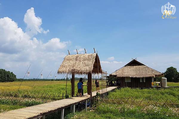 คาเฟ่ “มนต์รักบ้านนา” ตัวคาเฟ่จะถูกออกแบบให้เป็นบ้านไม้ไผ่หลังขนาดกะทัดรัดที่มีสะพานไม้เชื่อมริมถนนทางหลวงกับตัวคาเฟ่ที่ยื่นออกมากลางนาทำให้ลดความวุ่นวายเรื่องมลภาวะของเสียงรถยนต์และเปิดโล่งแบบ Open – Air รับลมได้ตลอดเวลา มีการตกแต่งภายในด้วยผ้าม่านสีขาวยาวตามเสาริมชานระเบียงในบ้านพร้อมโคมไฟแชนเดอเลียที่มีเอกลักษณ์จากงานแฮนด์เมดของไซพื้นบ้านที่ทำให้ตัวคาเฟ่มีความสว่างไสวเป็นสีส้มตัดกับบรรยากาศของโซฟาที่นั่งและโต๊ะไม้หวายลวดลายศิลปะได้อย่างหรูหราท่ามกลางบรรยากาศที่เรียบง่ายแบบวิถีชีวิตของทุ่งนาและวิวทิวเขาที่ทอดตัวยาวเห็นไกล ๆ สวยงาม อีกทั้งบางเทศกาลก็จะมีการปลูกทุ่งดอกไม้ไทยสวยงามที่หายากด้วย