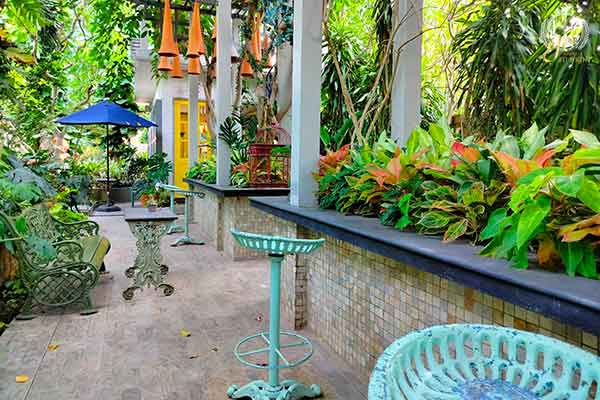 ในส่วนโซน Outdoor ของ “Mom’s Secret Garden” จะมีที่นั่งแบบบาร์ยาวอยู่ด้านหลังห้องปรับอากาศโซนสั่งเครื่องดื่มซึ่งตกแต่งด้วยต้นไม้ประดับประดาในมุมห้อยระย้าและตรงกลางบาร์ พร้อมปะติมากรรมกลีบดอกไม้เซรามิกที่ห้อยลงมาอย่างงดงามแฟนซีที่ทำให้นึกถึงดินแดนแฟรี่โธเปียในการ์ตูนบาร์บี้มาก เหมาะจะนั่งแบบสงบ ๆ