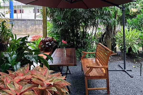 ที่นี่จะเป็นคาเฟ่สไตล์โฮมมี่ บรรยากาศดีมาก เพราะตั้งอยู่ในสวนมังคุด และมีต้นไม้ขึ้นอย่างหนาแน่น อากาศร่มรื่น เย็นสบาย ไม่ร้อน ใครที่ชื่นชอบบรรยากาศในสวนกันอยู่แล้ว รับรองได้เลยว่าที่นี่ต้องถูกใจคุณอย่างแน่นอน นั่งเพลินๆ อาจมีเผลอหลับกันได้เลย ภายในร้านจะมีพื้นขว้างกว้าง ด้านหน้ามีชื่อป้ายร้านที่ตั้งไว้อย่างโดดเด่นเป็นกำแพงช่องลมสีขาวสดใสสะอาดตา ด้านในแค่มองเข้าไปก็รู้สึกสบายตากันแล้วค่ะ เพราะจะมองไปทางไหนก็เห็นแต่สีเขียวของใบไม้ก่อนเป็นอันดับแรก ที่สำคัญสวนมังคุดของที่นี่ยังมีอายุกว่าร้อยปีเลยทีเดียว ภายในร้านจะออกแบบตกแต่งในสไตล์เรียบง่าย เหมือนบ้านในสวน ให้ความรู้สึกอบอุ่นเป็นกันเอง อารมณ์เหมือนได้เดินทางกลับบ้านต่างจังหวัดในช่วงวันหยุด สำหรับโซนนั่งของทางร้านจะเป็นลักษณะโอเพนแอร์กันนะคะ แต่รับรองได้เลยว่าไม่ร้อน เพราะมีแต่ร่มเงาไม้โอบล้อม ที่สำคัญยังมีลมพัดเอื่อยๆ เกือบตลอดเวลาอีกด้วย มาที่นี่เรายังจะได้สูดอากาศบริสุทธิ์กันแบบเต็มๆ ปอดเลยทีเดียว เหมือนได้มานั่งผ่อนคลายหลีกหนีความวุ่นวาย มาหามุมสงบเงียบๆ จิบเครื่องดื่มแก้วโปรด บอกเลยว่าใครที่กำลังหาไอเดียใหม่ๆ มาที่นี่สมองปลอดโปร่งโล่ง ความคิดบรรเจิดอย่างแน่นอน