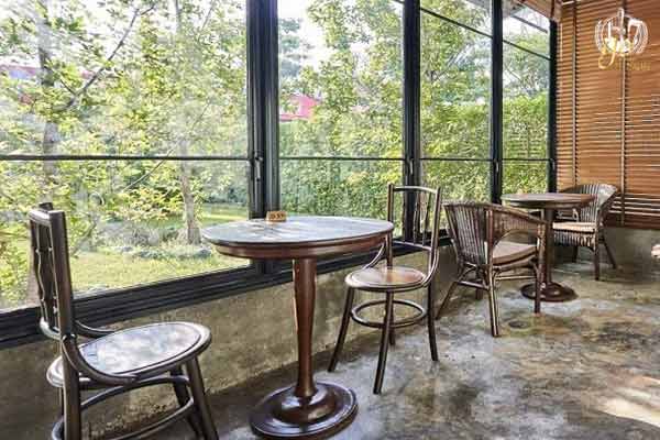 ร้านออกแบบตกแต่งในสไตล์ลอฟท์ แวดล้อมไปด้วยสวนร่มรื่น ตัวร้านจะเป็นลักษณะอาคาร 3 ชั้น ออกแบบตกแต่งโดยใช้สีในโทนเข้ม ผนังรอบด้านเป็นกระจกใส ที่ถ้ามองจากในร้านในวันที่ท้องฟ้าปลอดโปร่ง เรายังสามารถมองเห็นทิวเขาที่อยู่ไม่ไกลได้อย่างชัดเจน สำหรับมุมนั่งของทางร้านจะมีให้เลือกค่อนข้างมาก โดยเลือกนั่งได้ทั้งแบบ Indoor และ Outdoor กันเลยนะคะ หากลัวร้อนแนะนำให้นั่งด้านในตากแอร์เย็นฉ่ำๆ หรือถ้าชอบอากาศแบบสบายๆ ไม่ถึงกลับร้อนมากแต่ก็ไม่เย็นแนะนำเป็นโซนด้านนอก อย่างไรก็แล้วแต่หากคุณเดินทางมาในช่วงฤดูหนาว ไม่ว่าจะนั่งด้านนอกหรือด้านในอากาศก็จะเย็นสบายไม่แตกต่างกัน เพราะจังหวัดกาญจนบุรี ที่พื้นบางส่วนอยู่ติดเขา ทำให้ฤดูหนาวอากาศจะหนาวเย็น อาจไม่ถึงขนาดภาคเหนือ แต่ก็เย็นสบายเหมาะสำหรับการพักผ่อน