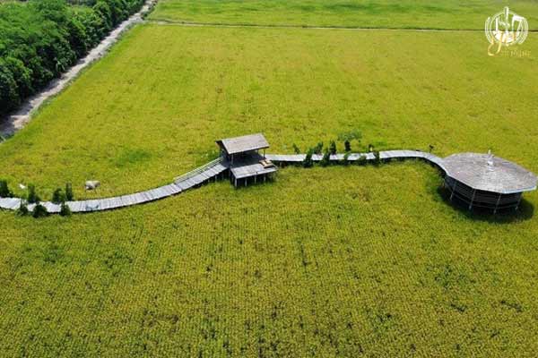 ภายในร้านมีพื้นที่ค่อนข้างกว้างขวาง เพราะมีทั้งที่เป็นพื้นที่สวนและเป็นทุ่งนา สำหรับไฮไลต์เด็ดของทางร้าน ที่หลายคนถ้าได้มีโอกาสแวะมาก็มักจะไม่ค่อยพลาดก็คือ สะพานในทุ่งนานั่นเองค่ะ ลงไปเดินเล่นสูดอากาศบริสุทธิ์ พร้อมชมบรรยากาศสวยๆ ของทุกนา บอกได้เลยว่าฟินสุดๆ ไม่เพียงเท่านั้นนะคะ ต้องบอกว่าบรรยากาศของทุ่งนาแต่ละช่วงเวลายังมีความสวยงามแตกต่างกันไปอีกด้วย ตั้งแต่ช่วงดำนา ข้าวเริ่มเป็นสีเขียวขจี รวมไปถึงตอนที่ต้นข้าวออกรวงเป็นสีเหลืองทอง มาตอนนั้นรับรองได้เลยว่าไม่ผิดหวังอย่างแน่นอน นอกจากนี้บริเวณด้านในยังมีบ่อน้ำใหญ่ ที่มีต้นตาลสูงปลูกไว้โดยรอบ ที่จะทำให้เรารู้สึกเหมือนเดินทางกลับบ้านในต่างจังหวัดกันเลยค่ะ ใครชอบบรรยากาศแบบนี้ห้ามพลาดแวะมาที่นี่กันนะคะ สำหรับในส่วนของตัวร้านจะเป็นอาคารกระจก ที่มุมให้เลือกนั่งได้ทั้งด้านนอกและด้านใน ด้านหน้าร้านยังมีสวนหย่อมไว้สำหรับนั่งเล่นได้อีกด้วย รวมทั้งใครอยากถ่ายรูปสวยๆ ที่นี่ก็มีมุมให้เลือกเยอะเลยทีเดียว