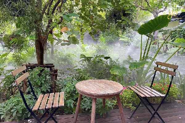 ภายในร้านนอกจากจะมีไอหมอกสวยๆ ให้เราได้ชมกันแล้ว ที่นี่ยังมีสายน้ำเป็นลำธารเล็กๆ และต้นไม้ที่ปลูกเอาไว้อย่างหนาแน่นกันอีกด้วยค่ะ ทำให้บรรยากาศภายในร้านร่มรื่น แต่ต้องยอมรับว่าไอหมอกจัดเป็นไฮไลท์ของทางร้านกันเลยทีเดียว สำหรับมุมนั่งของทางร้านจะมีอยู่ด้วยกัน 2 โซน ได้แก่ โซนด้านในร้าน และโซนในสวนที่คุณจะได้นั่งเล่นแบบใกล้ชิดธรรมชาติ ส่วนด้านในก็ไม่ต้องน้อยใจไปนะคะ เพราะทางร้านออกแบบให้เป็นกระจกใสรอบด้าน ทำให้ถึงแม้จะเลือกนั่งด้านในเราก็สามารถมองเห็นทัศนียภาพของธรรมชาติสวยๆ นอกร้านกันได้อย่างเต็มที่เช่นกัน แถมด้านในยังมีแอร์ฉ่ำๆ ให้นั่งแบบสบายๆ กันอีกด้วยค่ะ แต่ด้านนอกก็ไม่ต้องกลัวร้อนกันนะคะ เพราะมีต้นไม้ใหญ่ขึ้นอย่างหนาแน่น และเป็นร่มเงาได้เป็นอย่างดี นอกจากนี้ยังมีลมพัดเอื่อยๆ มาตลอด ทำให้ถึงแม้เลือกนั่งด้านร้อนก็นั่งกันได้อย่างสบาย