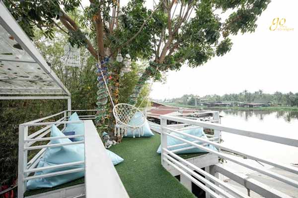คาเฟ่แห่งนี้นอกจากตั้งอยู่ริมแม่น้ำท่าจีนแล้ว ภายในพื้นที่รอบอาคารยังแวดล้อมไปด้วยสวนร่มรื่น และสระบัว ยิ่งทำให้บรรยากาศด้านในดูสบายๆ และช่วยให้เรารู้สึกผ่อนคลายได้เป็นอย่างดี ส่วนตัวร้านเป็นอาคารสีขาวดูสวยโดดเด่นสะดุดตา รับกับสีเขียวๆ ของต้นไม้โดยรอบได้เป็นอย่างดี เพราะยิ่งทำให้ตัวอาคารดูโดดเด่นมากยิ่งขึ้น นอกจากนี้ผนังโดยรอบยังออกแบบเป็นกระจกใสใบใหญ่ ที่ช่วยให้ภายในร้านมองเห็นทัศนียภาพที่สวยงามของภายนอกได้อย่างชัดเจน เรียกได้ว่าบรรยากาศดีมากๆ เลยค่ะ สำหรับโซนนั่งของทางร้านยังมีให้เลือกได้ทั้งแบบ Indoor และ Outdoor ด้านในเปิดแอร์เย็นฉ่ำ มีมุมให้เลือกนั่งได้หลากหลายมุมเช่นกัน ส่วนโซนด้านนอกแทบไม่ต้องพูดถึง เพราะจะร่มรื่นเป็นอย่างมาก โดยเฉพาะโซนริมแม่น้ำท่าจีน และริมสระบัว หากเป็นช่วงเย็นหรือหลังจากแดดร่มลมตก นอกจากบรรยากาศจะดีแล้ว ยังโรแมนติกกันอีกด้วย ใครชื่นชอบการถ่ายภาพบอกได้เลยว่ามาที่นี่คุณจะไม่ผิดหวังอย่างแน่นอน