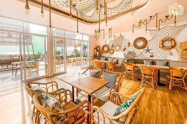 ร้านเป็นลักษณะอาคาร 2 ชั้น ภายในมีพื้นที่กว้างขวางออกแบบตกแต่งสไตล์บาหลี คุมโทนสีขาวแซมสีน้ำตาล สำหรับโซนนั่งมีให้เลือกได้ทั้งแบบ Indoor และ Outdoor รวมไปถึงบริเวณชั้นสองที่เป็นดาดฟ้า ถึงอาจจะไม่สูงมาก แต่บริเวณนี้เราก็สามารถมองเห็นวิวทะเลได้ไกลสุดสายตา และยังเป็นลักษณะเปิดโล่ง ที่ในช่วงเวลากลางวันจะรับแสงแดดได้อย่างเต็มที่ กลางวันอาจจะร้อนแต่รับรองได้เลยว่าถ่ายรูปออกมาจะสวยมาก ส่วนบริเวณด้านล่างจะมีที่นั่งให้เลือกค่อนข้างเยอะ แถมมาพร้อมแอร์เย็นฉ่ำๆ ใครกลัวร้อนแนะนำให้เลือกนั่งโซนนี้ หรือถ้าอยากรับลมทะเลเย็นๆ แบบลมธรรมชาติ โซนด้านอกตัวอาคารก็น่านั่งเช่นเดียวกัน ไม่ร้อนแถมบรรยากาศยังดีอีกด้วย โดยเฉพาะช่วงเย็นหลังแดดร่มลมตกไปแล้ว ส่วนใหญ่ลูกค้าจะชอบนั่งโซนนี้กันเป็นพิเศษ