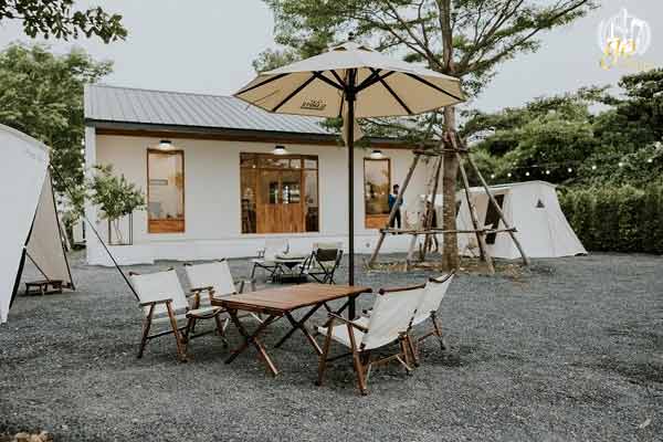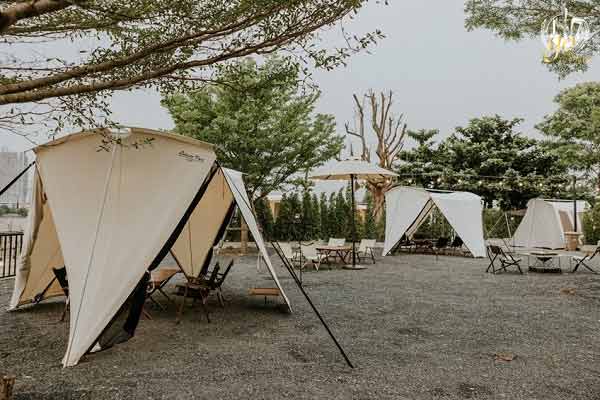 ร้านมีพื้นที่กว้างขวางพอสมควร แต่ภายในตัวร้านจะมีขนาดเล็ก โดยเราสามารถเลือกนั่งได้ทั้งด้านในและด้านนอกกันเลยนะคะ แต่ต้องบอกว่าด้านนอกจะมีมุมสวยๆ ให้เลือกนั่งได้เยอะกว่า โดยเฉพาะโซนริมน้ำบอกได้เลยว่าต้องห้ามพลาดอย่างเด็ดขาด เพราะจะเป็นมุมที่เราสามารถมองเห็นวิวตึกมหานครได้อย่างชัดเจน ซึ่งจะเป็นมุมที่สวยงามทั้งกลางวันและกลางคืนกันเลยค่ะ การตกแต่งร้านส่วนใหญ่จะเน้นใช้เป็นโทนสีขาว ทั้งตัวร้านและเต็นท์ ส่วนเฟอร์นิเจอร์อื่นจะเป็นวัสดุไม้ และเป็นประเภทอุปกรณ์แคมป์ปิ้ง ทั้งเต้น เก้าอี้ และ ร่ม นอกจากนี้รอบบริเวณยังเขียวขจีไปด้วยสีของต้นไม้น้อยใหญ่ ยิ่งทำให้บริการภายในร้านดูร่มรื่นมากยิ่งขึ้น ส่วนโซนด้านในจะมาพร้อมแอร์เย็นฉ่ำ และตกแต่งด้วยอุปกรณ์แคมป์ปิ้ง เรียกได้ว่าบรรยากาศดีไม่แพ้ด้านนอกเช่นกัน และถ้าคุณเป็นสายแคมป์ปิ้งเชื่อแน่ว่าคุณจะต้องหลงรักที่นี่อย่างแน่นอน