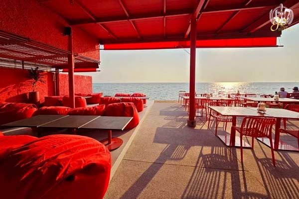 จุดเด่นจริงๆ เลยก็คือเป็นคาเฟ่สีแดงเพลิงที่ต้องบอกว่าสีสันสดใสโดดเด่นเป็นอย่างมาก และยังมองเห็นได้จากระยะไกลกันเลยทีเดียว ที่สำคัญดีไซน์ตัวอาคารยังออกแบบแหวกแนวและไม่ซ้ำแบบใครกันอีกด้วย โดยเฉพาะช่วงหลังคาที่ออกแบบเป็นลักษณะโค้งมน รวมทั้งยังเป็นจุดที่ลูกค้าสามารถขึ้นไปเดินเล่น นั่งเล่น หรือถ่ายภาพสวยกันได้ เป็นการออกแบบที่ไม่ได้คำนึงถึงเพียงความสวยอย่างเดียว แต่ยังมีประโยชน์ในการต้อนรับลูกค้ากันอีกด้วย ไม่เพียงเท่านั้นนะคะ คาเฟ่ยังตั้งอยู่ติดริมทะเล บนหาดส่วนตัวที่เงียบสงบ หันหน้าออกทะเล บริเวณนี้เรายังสามารถนั่งชมพระอาทิตย์ตกดิน บอกได้เลยว่าสวยไม่แพ้ที่ไหนเช่นกัน สำหรับโซนนั่งของทางร้านจะมีให้เลือกได้ทั้งด้านในและด้านนอก ไม่ว่าบริเวณไหนเราก็มองเห็นวิวทะเลกันได้แบบชัดเจน โดยเฉพาะใครเลือกนั่งข้างนอก คุณจะได้นั่งชมวิวรับลมทะเลกันได้อย่างจุใจเลยทีเดียว ภายในร้านนอกจากจะมีพื้นที่ค่อนข้างขวาง ยังมีมุมถ่ายภาพสวยๆ เยอะมาก