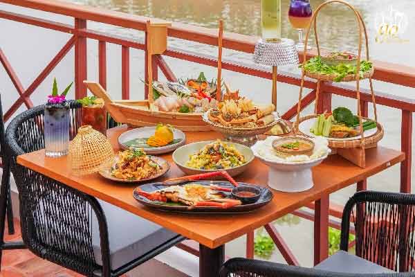 เมนูของทางร้านจะมีให้เลือกค่อนข้างหลากหลาย โดยเฉพาะเมนูอาหารไทยที่จะเป็นสูตรเฉพาะของทางร้าน สำหรับเมนู อื่นๆ ที่เราอยากจะแนะนำก็อย่างเช่น กำปั่นทอง เป็นเมนูอาหารทะเลที่มีทั้ง หอยนางรมสด ปูดอง กั้งดอง กุ้งดอง และ ซาซิมิปลาไทย ที่เสิร์ฟมาในเรือกำปั่นไม้ขนาดใหญ่ ต่อด้วย กระจ่างฟ้า เมนูนี้จะเป็นปอเปี๊ยะกระจกเนื้อปลากรายผสมกุ้ง ห่อด้วยแผ่นแป้งและทอดจนเป็นสีเหลืองน่ารับประทาน เสิร์ฟพร้อมน้ำจิ้มสามรสสูตรของทางร้าน แนะนำอีกสักเมนูเป็น เมี่ยงบุปผา เป็นเมนูเมี่ยงที่มีกรีบดอกบัวเป็นส่วนประกอบ บอกเลยว่าน่าทานมาก ส่วนเครื่องดื่มก็อย่างเช่น ชาไทย, ช็อกโกลแลตเย็น และ รวงผึ้ง ซึ่งเป็นส้มจิ๊ดผสมส้มยูชู รสชาติเปรี้ยวอมหวาน ดื่มแล้วช่วยให้รู้สึกสดชื่น