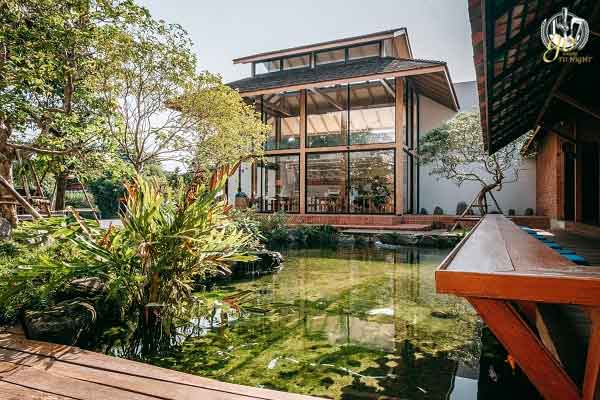 คาเฟ่สวยออกแนวเรียบๆ แค่มองก็สัมผัสได้ถึงความเป็นญี่ปุ่นกันแล้วค่ะ เพราะรูปทรงอาคารจะเป็นแนวญี่ปุ่นกันเลย บวกกับการจัดตกแต่งสวนด้านนอกก็ได้อารมณ์ของความเป็นญี่ปุ่นกันมาแบบจัดเต็ม โดยเฉพาะอาคารด้านหน้าที่เป็นอาคารกระจกทรงสูง หลังคาด้านบนออกแนวคล้ายหลังคาที่เราเห็นได้ง่ายๆ หากเดินทางไปยังญี่ปุ่น และยังมีรูปทรงที่ค่อนข้างโดดเด่นสะดุด เอาเป็นว่าหากขับรถผ่านเราคงอดเลี้ยวมองไม่ได้อย่างแน่นอน ภายในร้านยังเน้นใช้โทนสีสันเป็นสีน้ำตาลอ่อนสลับกับสีขาวมองดูสวยแบบเรียบง่าย และสบายตา ออกแนวเหมือนการตกแต่งสไตล์มินิมอล ซึ่งเป็นรูปแบบการตกแต่งที่กำลังได้รับความนิยมในบ้านเรา เรียบแต่หรูและดูดี ภายในร้านยังมีบ่อน้ำที่มีปลาคาร์ปแหวกว่ายกันอยู่เบื้องล่าง และมีมุม นั่งชิลชิล ให้เรานั่งชมธรรมชาติสวยๆ ริมบ่อได้อีกด้วย เป็นลักษณะนั่งห้อยขา บอกได้เลยว่าใครนั่งมุมนี้จะรู้สึกผ่อนคลายสุดๆ กันเลยค่ะ สำหรับโซนนั่งจะมีให้เลือกค่อนข้างมาก ทั้งโซนด้านในและด้านนอกกันเลย ใครเลือกนั่งโซนด้านนอกก็ไม่ต้องกลัวว่าจะร้อนกันนะคะ เพราะมีต้นไม้ขึ้นปกคลุมค่อนข้างหนาแน่นทำให้บรรยากาศร่มรื่นเป็นอย่างมาก แถมยังมีมุมถ่ายรูปเพียบ ใครแวะมาถ่ายรูปอาจเหมือนแอบหนีมาเที่ยวญี่ปุ่นกันเลยทีเดียว