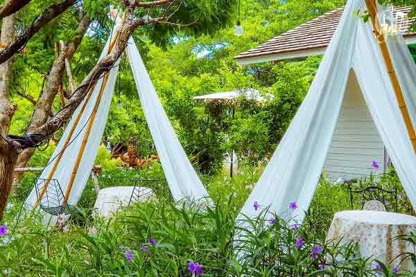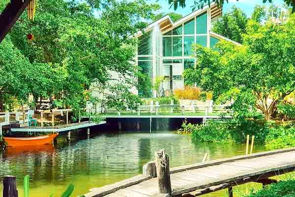 ตัวคาเฟ่เป็นอาคารกระจกใส มีพื้นที่กว้างขวาง แวดล้อมด้วยสวนร่มรื่นที่มีต้นไม้น้อยใหญ่ขึ้นอยู่มากมายมองเป็นสีเขียวขจีสดใส ให้ร่มเงาไปรอบบริเวณ ไม่เพียงเท่านั้นและยังตั้งอยู่ริมน้ำอีกด้วย ทำให้บรรยากาศร่มรื่น เหมาะสำหรับการพักผ่อน มีโซนให้เลือกนั่งมากมาย ทั้งด้านในและด้านนอก รวมไปถึงมีมุมสวยๆ ให้ถ่ายภาพมากมาย แต่รับรองได้เลยว่าหลายคนต้องสนใจด้านนอกกันอย่างแน่นอน เพราะนอกจากจะมีอากาศสดชื่นลมพัดเย็นสบายแล้ว ยังมีทัศนียภาพที่สวยงามอีกด้วย นอกจากนี้หากใครพายเรือเป็น ที่นี่เขาก็มีเรือให้เราลงไปพายในสระกว้างกันได้ ไม่เพียงเท่านั้นนะคะ โต๊ะนั่งบางมุมยังออกแบบตกแต่งในสไตล์อังกฤษ เหมาะสำหรับนั่งจิบน้ำชายามบ่ายเป็นอย่างมาก มุมนี้ยังถ่ายรูปออกมาสวยอีกด้วย