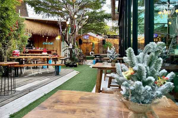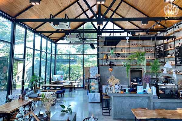 ตัวร้านเป็นอาคารชั้นเดียว หลังคาทรงสูงโปร่ง ภายในออกแบบตกแต่งไสตล์อินดัสเทรียลหรือสไตล์ลอฟท์ ที่โชว์โครงสร้างของเสาและคาน ในลักษณะเดียวกับโรงงานหรือที่เราเคยเห็นในโกดังส่วนใหญ่ โดยที่นี่จะโชว์เป็นโครงเหล็กสีดำ นอกจากนี้ผนังเกือบรอบด้านส่วนใหญ่จะเป็นกระจกใส ที่นอกจากจะช่วยให้ภายในร้านดูโล่ง โปร่ง กว้างขวางขึ้น ยังช่วยให้ด้านในรับแสงสว่างจากด้านนอกได้อย่างเต็มที่ สำหรับโซนนั่งของทางร้านจะมีให้เลือกได้ทั้งแบบ Indoor และ Outdoor ส่วนเคาน์เตอร์อาหารและเครื่องดื่มจะอยู่บริเวณด้านนอก ที่ออกแบบตกแต่งในสไตล์กระท่อม บรรยากาศอบอุ่นเป็นกันเอง จริงๆ แล้วร้านมีพื้นที่กว้างขวางพอสมควรเลยทีเดียว ทำให้นอกจากจะมีมุมนั่งให้เลือกเยอะแล้ว ยังมีมุมถ่ายภาพสวยๆ เยอะด้วยเช่นกัน นอกจากนี้ในช่วงยามเย็นยังมีดนตรีสดมาขับกล่อมให้เราฟังกันอีกด้วย เรียกได้ว่าร้านเหมาะสำหรับลูกค้าทุกรูปแบบ ไม่ว่าคุณจะเดินทางมาคนเดียว มากับคู่รัก มากับกลุ่มเพื่อน หรือมากับเพื่อนสนิท