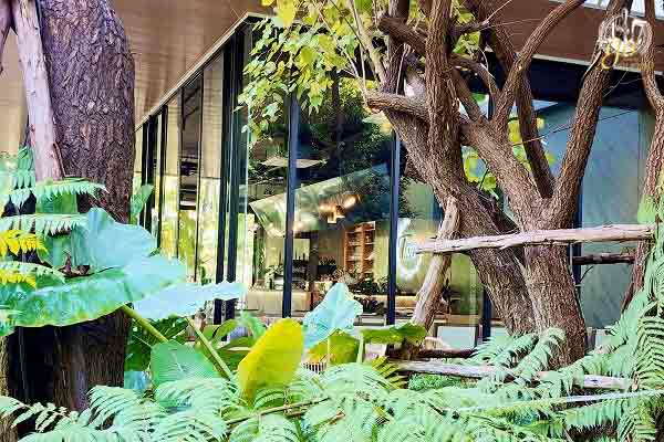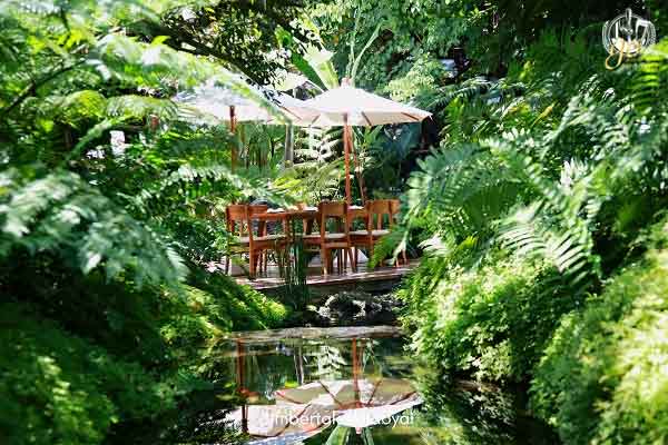 ภายในร้านบรรยากาศค่อนข้างจะร่มครึ้ม เป็นสีเขียวขจี เพราะแวดล้อมไปด้วยต้นไม้ที่ขึ้นอย่างหนาแน่น นอกจากนี้มุมหนึ่งยังมีน้ำตกจำลอง ยิ่งทำให้บรรยากาศภายในร้านดูสดชื่นเป็นอย่างมาก ในน้ำยังมีปลาคาร์ปสีสันสดใสแหวกว่ายไปมาให้เราได้ชมกันเพลิน ๆ อีกด้วย สำหรับตัวร้านจะเป็นลักษณะอาคารชั้นเดียว หลังคาสูง ดูโปร่งโล่งและกว้างขวาง ด้านบนเป็นดาดฟ้าให้ขึ้นไปนั่งเล่นชมวิวกันได้ นอกจากนี้ผนังภายในร้านส่วนใหญ่ยังเป็นกระจกใส ทำให้ใครที่เลือกนั่งด้านในยังมองเห็นธรรมชาติและสีเขียวสดใสของต้นไม้ได้อย่างชัดเจน ส่วนเฟอร์นิเจอร์ส่วนใหญ่จะเน้นเป็นวัสดุที่ทำมาจากไม้ ที่บอกได้เลยว่าเข้ากับบรรยากาศได้เป็นอย่างดี มีโซนให้เลือกนั่งค่อนข้างมากทั้งบริเวณด้านในและด้านนอก ซึ่งก็ดูน่านั่งทุกมุมกันเลยทีเดียว