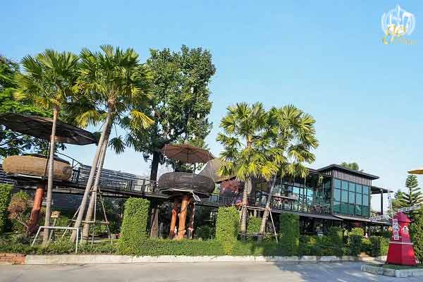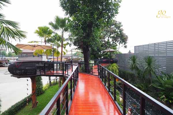 คาเฟ่ตั้งอยู่ใจกลางสวนสีเขียวสุดร่มรื่น ล่าสุดทางคาเฟ่ยังได้มีการเปิดโซนใหม่เป็นสะพานข้ามสระที่มาพร้อมน้ำตกจำลอง และด้านล่างมีฝูงปลาคาร์ฟสีสันสดใสแหวกว่ายไปมา ในบรรยากาศสบายๆ ให้ความรู้สึกสดชื่นเหมือนได้ยืนอยู่ท่ามกลางธรรมชาติ นอกจากนี้ยังมีมุมถ่ายภาพสวยๆ อยู่ค่อนข้างเยอะไม่ว่าจะเป็น บันไดสวรรค์พร้อมปีกนางฟ้า, ชิงช้ารูปหัวใจ, กังหันลมสีแดงสุดคิ้วท์, สกายวอล์ค และซุ้มรังนก เป็นต้น ไม่เพียงเท่านั้นนะคะ มุมนั่งของทางร้านก็ยังมีให้เลือกเยอะมากเช่นกัน โดยจะมีทั้งโซนด้านในพร้อมแอร์เย็นฉ่ำๆ และโซนด้านนอกใต้ร่มเงาไม้ใหญ่ แต่ไม่ว่าจะเป็นโซนไหนเราก็จะมองเห็นสีเขียวขจีของต้นไม้ได้อย่างชัดเจน บอกได้เลยว่าช่วยให้รู้สึกผ่อนคลายได้เป็นอย่างดี