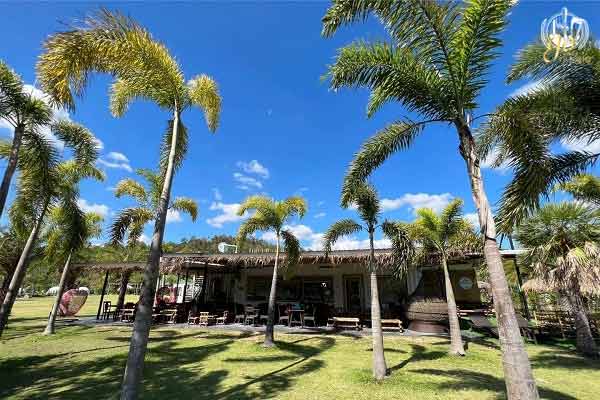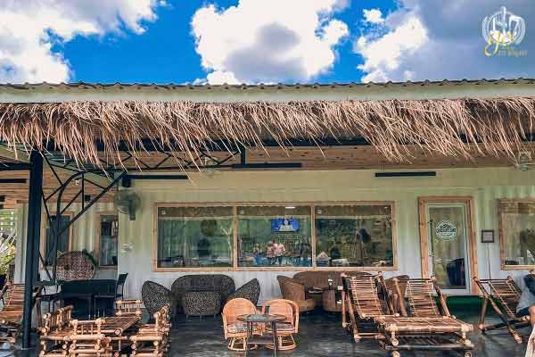รอบบริเวณร้านมีพื้นที่กว้างขวางมาก ส่วนตัวร้านจะเป็นอาคารชั้นเดียว ตกแต่งด้วยฟางและเฟอร์นิเจอร์ไม้ ตัวร้านมีขนาดไม่ใหญ่มา หันหน้าออกไปทางริมแม่น้ำ เพื่อให้ได้รับลมแม่น้ำเย็นๆ ได้ตลอดทั้งวัน ทำให้หากเราเลือกนั่งโซนด้านนอกก็ไม่ต้องกลัวร้อนกันนะคะ เพราะนอกจากลมพัดจากแม่น้ำแล้วยังมีต้นไม้ใหญ่คอยให้ร่มเงาแบบธรรมชาติกันอีกด้วย แต่ถ้าใครอยากเลือกนั่งแอร์เย็นๆ ด้านในก็ได้เช่นกัน แต่โซนด้านนอกจะมีมุมให้เลือกได้นั่งได้ค่อนข้างเยอะ ที่สำคัญแต่ละมุมยังจัดไว้อย่างสวยงาม และมีบรรยากาศดี รับรองได้เลยว่าคงตัดสินใจเลือกมุมนั่งกันยากพอสมควรเลยทีเดียว โดยเฉพาะสายเชลฟี่ เพราะมุมไหนก็เหมาะถ่ายภาพไปเสียหมด แต่ไม่ต้องกังวลไปนะคะ หากมาในช่วงที่ยังมีลูกค้าไม่เยอะ เราสามารถเดินไปนั่งถ่ายรูปเก๋กันได้ทุกมุมกันเลยค่ะ หรือจะเดินเล่นชมบรรยากาศของรีสอร์ทก็ได้เช่นกัน