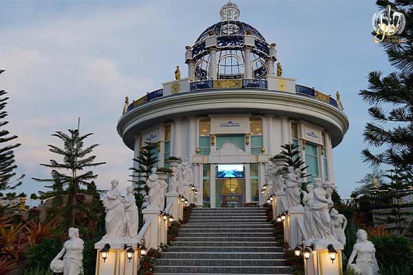 คาเฟ่ “The Pandora Camp เขาใหญ่” ตัวคาเฟ่ถูกออกแบบมาให้เป็นตึกยุโรปทรงโดมขนาดมหึมาบนยอดเขาที่มีศิลปะคล้ายกับพระราชวังของประเทศฝรั่งเศสที่ภายในประดับประดาด้วยโคมไฟห้อยระย้าสวยงามแบบแกรนด์ ๆ และมีประติมากรรมแบบตะวันตกยุคคลาสสิกที่มีความประณีตให้คุณได้ถ่ายรูปและนั่งหรูหราแบบดัชเชส ดยุคด้วย มีลิฟต์แก้วที่พาคุณขึ้นมาบนห้องคาเฟ่ได้ หรือจะออกไปข้างนอกรับลมหนาวถ่ายรูปคู่กับปะติมากรรมมือยักษ์ที่สามารถเดินมาเห็นวิวเขาใหญ่ได้ 360 องศาเลย และยังมีสะพานสกายวอล์คทางเดินกระจกใสที่ยาวกว่า 60 เมตร ชวนให้หวาดเสียวเล่น ๆ ด้วย โดยในส่วนของที่พักจะเป็นบ้านพูลวิลล่าหลัง ๆ ที่อยู่ตามไหล่เขาลดหลั่นกันลงมาเห็นวิวได้อลังการเช่นกัน