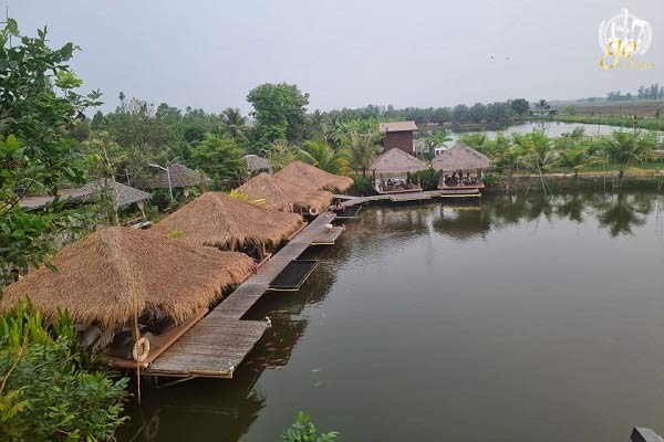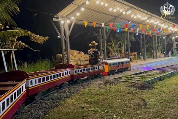 ภายในร้านมีพื้นที่กว้างขวาง บรรยากาศดี ร่มรื่น เพราะมีต้นไม้ขึ้นอยู่รอบบริเวณกันเลยทีเดียวค่ะ และที่สำคัญไฮไลท์ของที่นี่ก็คือมีชานชาลารถไฟอยู่ด้วยนั่นเอง ไม่ได้มีเพียงแค่ชานชาลานะคะ เพราะมีรถไฟวิ่งผ่านกันอีกด้วย ใครสนใจขึ้นรถไฟไปนั่งรอกันได้เลย ที่สำคัญถึงแม้จะเห็นเป็นรถไฟคันเล็ก ๆ ที่มีขนาดไม่ใหญ่มาก แต่สามารถขึ้นได้ทั้งเด็กและผู้ใหญ่กันเลย ต้องบอกว่าเด็ก ๆ จะชอบมากเป็นพิเศษ โดยรถไฟจะวิ่งไปรอบๆ บริเวณพื้นที่ร้าน ให้เราได้ชมวิวทิวทัศน์และรับลมเย็น ๆ ไปในตัว สำหรับตัวร้านจะเป็นลักษณะอาคารสองชั้น ที่โซนให้เลือกนั่งได้ทั้งด้านในและด้านนอก แต่ดูเหมือนว่าหลายคนน่าจะสนใจบริเวณด้านนอกมากกว่า โดยเฉพาะโซนริมน้ำ ที่ปลูกเป็นลักษณะกระท่อมยื่นลงไปในสระน้ำขนาดใหญ่พร้อมมีเฉลียงยื่นออกไปให้นั่งเล่นกันได้ ช่วงยามเย็นบรรยากาศจะค่อนข้างดีเลยทีเดียว และยังเป็นช่วงที่มีดนตรีสดมาขับกล่อมให้เราได้ฟังกันอีกด้วย หรือเป็นโซนนั่งในสวนก็ดูน่านั่งไม่แพ้กัน ใครชอบแบบไหนเลือกกันได้ตามต้องการกันเลยนะคะ