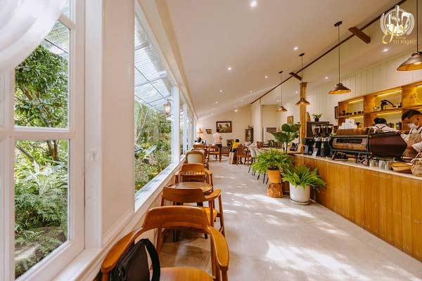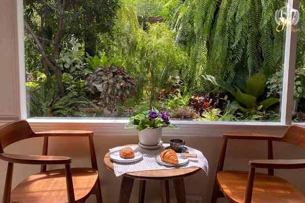 เพียงแค่ขับรถเข้ามาในบริเวณร้าน คุณก็จะสัมผัสได้ถึงความร่มรื่น เพราะอันดับแรกเราต้องขับผ่านซุ้มต้นไม้ขนาดใหญ่ ที่มองดูเหมือนกำแผงต้นไม้โอบรอบตลอดทั้งสองข้างทาง มองเห็นเป็นสีเขียวขจี ต้นไม้ที่นี่มีเยอะมากๆ ทั้งต้นเล็กต้นใหญ่ หลากหลายสายพันธุ์ แถมยังมีทั้งไม้ดอก และไม้ประดับกันเลยทีเดียว ใครเข้ามาอาจจะเข้าใจผิดก็ได้ว่าเราไมได้มาคาเฟ่ แต่เรามาร้านขายต้นไม้ จากลานจอดรถเดินตามทางไปอีกเล็กน้อยก็จะมาถึงตัวร้านกันแล้วค่ะ ร้านจะเป็นลักษณะอาคารชั้นเดียว ด้านในตกแต่งเป็นโทนสีขาววัสดุส่วนใหญ่มาจากไม้ และมีต้นไม้วางประดับไว้ตามมุมต่างๆ รวมไปถึงผนังด้านหนึ่งจะออกแบบให้เป็นกระจกบานใหญ่ที่มองเห็นต้นไม้ด้านนอกอย่างชัดเจน ช่วยให้ภายในมีบรรยากาศร่มรื่นไม่แตกต่างจากด้านอกกันเลยค่ะ ที่สำคัญด้านในยังหอมกลิ่นเบเกอรี่สุดๆ ใครหิวมาอาจมีท้องร้องเอาง่ายๆ กันเลย สำหรับมุมนั่งจะมีให้เลือกสองโซนทั้งแบบ Indoor และ Outdoor เลือกกันได้ตามอัธยาศัย ซึ่งก็ต้องบอกก่อนว่าด้านนอกอากาศยังเย็นสบายตลอด เพราะอยู่ใต้ร่มเงาไม้ และมีลมพัดมาเอื่อยๆ ใครชอบใกล้ชิดธรรมชาติแนะนำเป็นโซนด้านนอกกันเลยค่ะ
