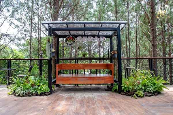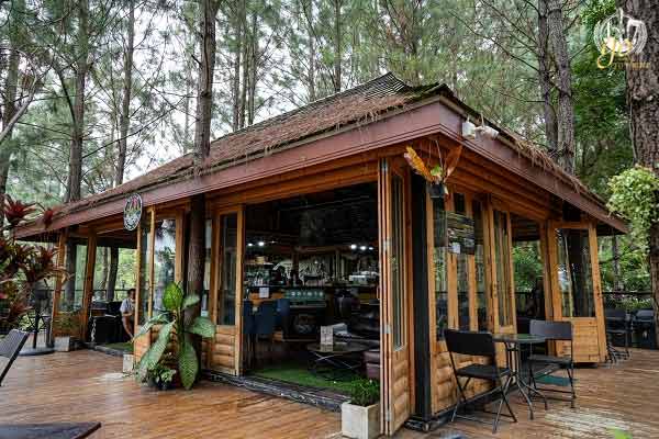 ตัวคาเฟ่จะเป็นลักษณะอาคารไม้ ยกพื้นสูง ที่ตั้งอยู่ท่ามกลางต้นสน ประมาณว่าจะไม่มีการตัดต้นสนทิ้งเลยนะคะ ตรงไหนที่มีต้นสนเราก็จะเห็นร้านปลูกค่อม ประมาณว่าเห็นต้นสนทะลุหลังคาขึ้นไปเลยทีเดียว นอกจากนี้วัสดุส่วนใหญ่ยังเน้นเป็นวัสดุไม้สีโทนน้ำตาลทั้งหมด ที่มองดูแล้วเข้ากับบรรยากาศโดยรอบได้อย่างตัว ขึ้นมาด้านบนนอกจากจะเย็นสบาย เรายังมองเห็นวิวทิวทัศน์ได้ไกลสุดสายตากันอีกด้วย บอกได้เลยว่าวิวด้านบนสวยมาก เพราะมองไปทางไหนก็จะเห็นเป็นสีเขียวขจีของต้นไม้ใหญ่ที่ขึ้นอยู่อย่างหนาแน่น แถมที่นี่จะมีอากาศเย็นสบายตลอดทั้งปีอีกด้วย รวมไปถึงในช่วงฤดูหนาวอากาศจะค่อนข้างหนาวเย็น ใครอยากมาสัมผัสอากาศเย็นๆ ไม่ต้องเดินทางไกลไปถึงเหนือสุด มาที่นี่ก็รับรองไม่ผิดหวัง สำหรับโซนนั่งของทางร้านจะมีให้เลือกได้ทั้งด้านในและด้านนอก ซึ่งทั้งหมดจะเป็นแบบโอเพนแอร์นะคะ แต่อย่างที่เราบอกไปแล้วตั้งแต่ข้างต้นว่าอากาศเย็นสบาย มีลมพัดมาเกือบตลอดเวลา จริงๆ แล้วแค่เห็นบรรยากาศร้าน ใครมาเหนื่อยๆ ก็จะรู้สึกหายเป็นปลิดทิ้งกันเลยค่ะ