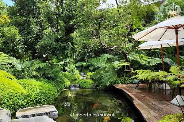 ไม่ต้องบอกหลายคนน่าจะพอเดากันได้ แน่นอนอยู่แล้วว่าที่นี่ต้องแวดล้อมไปด้วยต้นไม้น้อยใหญ่อวดสีเขียวสดใส รอบบริเวณ ตัวร้านออกแบบเป็นอาคารสองชั้นในลักษณะสูงโปร่ง บริเวณด้านบนจะเป็นดาดฟ้าให้เราขึ้นไปนั่งเล่นจิบเครื่องดื่ม และชมวิวสวยๆ ของเขาใหญ่กันได้ เป็นอีกมุมหนึ่งที่น่าสนใจไม่น้อยเลยทีเดียว โดยเฉพาะใครที่ชื่นชอบการถ่ายภาพอยากแฉะภาพสวยๆ บอกเลยต้องห้ามพลาดอย่างเด็ดขาด เพราะเราสามารถเดินดูได้รอบแบบ 360 องศากันเลยค่ะ นอกจากนี้ภายในร้านยังเน้นทำผนังรอบด้านเป็นกระจกใส ใครนั่งด้านก็ยังได้ชมธรรมชาติและมองเห็นสีเขียวๆ สดใสของต้นไม้ได้อย่างชัดเจน ช่วยให้รู้สึกผ่อนคลายได้เป็นอย่างดี แต่เชื่อแน่ว่าหลายคนถ้าเห็นบรรยากาศด้านนอก คงรู้สึกอยากนั่งเล่นพักผ่อนท่ามกลางธรรมชาติกันอย่างแน่นอน ที่สำคัญอากาศร่มรื่นและไม่ร้อน เพราะเราจะอยู่ใต้เงาของร่มไม้ใหญ่ที่มีลมผัดมาเอื่อยๆ เกือบตลอดเวลา นอกจากนี้ภายในสวนของทางร้านยังมีลำธารน้ำใสไหลรินที่มาพร้อมน้ำตกเล็กๆ และมีปลาคาร์ปสีสวยๆ ว่ายกันไปมา ยิ่งทำให้รู้สึกผ่อนคลายมากยิ่งขึ้น