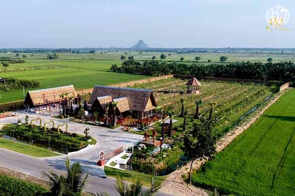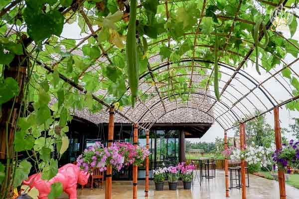ตัวร้านมีขนาดค่อนข้างใหญ่ ไกลจากทางเข้าพอสมควร ซึ่งถึงจะเป็นทุ่งนาแต่ถนนหนทางก็สะดวก เพราะทางร้านเทปูนคอนกรีตอย่างดี มีที่จอดรถด้านหน้ากว้างขวาง ตัวร้านสร้างเป็นแบบหลังคาทรงสูงมุมจาก ที่ดูกลมกลืนกับบรรยากาศโดยรอบเป็นอย่างมาก มีมุมเลือกนั่งได้หลากหลาย ทั้งโซนด้านในและด้านนอก ทางด้านเข้าร้านยังออกแบบให้เป็นสุ่มปลูกพืชไม้เรื่อย โดยของทางร้านจะเป็นต้นฟักนั่นเองค่ะ ผลจะมีขนาดเรียวยาว ถ้าคุณมาช่วงที่กำลังออกผล จะห้อยระย้าลงมาตามทาง ดูสวยแปลกตาไปอีกแบบ คงอดใจยื่นมือไปสัมผัสไม่ได้อย่างแน่นอน แต่อย่าจับแรงนะคะ เพราะพืชผักเหล่านี้อาจช่ำได้ และจะทำให้ไม่น่ารับประทานกันอีกด้วย แต่ถ้าเป็นไปได้หลีกเลี่ยงไม่จับจะดีที่สุด สำหรับเฟอร์นิเจอร์ภายในร้านส่วนใหญ่จะเน้นเป็นวัสดุไม้ ทั้งโซนด้านนอกและด้านใน โดนด้านนอก ใกล้ๆ กันนอกจากทุ่งนากว้างสุดสายตาแล้ว ยังมีสวนกล้วย และมีทางเดินทอดยาวให้เราสามารถเดินไปนั่งตามสุ่มต่างๆ กันได้อีกด้วย