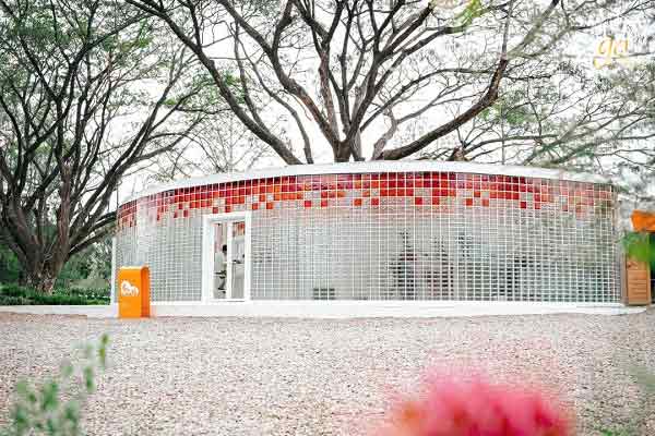 ร้านตั้งอยู่ริมน้ำ ออกแบบตกแต่งด้วยดีไซน์สุดเก๋ เป็นอาคารทรงโค้งคล้ายรูปทรงกลมที่มีขนาดใหญ่ และใช้บล็อกแก้วไล่โทนสีสร้างเป็นผนังรอบด้านดูสวยสะดุดตา และไม่เหมือนใครกันอีกด้วย ไม่เพียงเท่านั้นนะคะร้านยังตั้งอยู่ท่ามกลางธรรมชาติของป่าไม้สีเขียวขจี สีสันของธรรมชาติยังสะท้อนไปยังบล็อกแก้ว ที่ทำให้อาคารดูมีมิติมากยิ่งขึ้น รวมทั้งบริเวณนี้เรายังสามารถมองเห็นวิวภูเขาได้แบบ 360 องศาอีกด้วย และตัวร้านนอกจากด้านหน้าจะติดน้ำแล้ว บริเวณโซนกลางยังมีต้นไม้ใหญ่ที่แผ่กิ่งก้านสาขาไปรอบด้าน ช่วยให้ภายในร้านมีบรรยากาศร่มรื่น และเหมาะสำหรับการนั่งเล่นพักผ่อน ส่วนโซนนั่งของทางร้านจะมีให้เลือกทั้งแบบ Indoor และ Outdoor บอกได้เลยว่าน่านั่งทุกมุม แถมถ่ายรูปออกมายังสวยปังกันอีกด้วย นอกจากนี้ที่นี่ยังมีพื้นที่เล่นสำหรับเด็ก ที่มาพร้อมสวนน้ำ และยังยินดีต้อนรับสัตว์เลี้ยงอีกด้วย