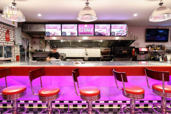 “V8 Dinner Bar & Restaurant” เป็นคาเฟ่กึ่งบาร์สไตล์ยุค 90’s ของอเมริกาที่เหมือนเราได้หลุดเข้าไปอยู่ในภาพยนตร์เรื่อง “Riverdale”กันเลยทีเดียว ซึ่งจะเป็นรูปแบบบาร์ Pop’s Chock’Lit Shoppe ที่ตกแต่งด้วยไฟนีออนสดใส เสิร์ฟอาหารเป็นพวกแฮมเบอร์เกอร์และมิลค์เชคที่คนยุค 90’s น่าจะชินตากับภาพเหล่านี้จนมองภาพของ V8 Dinner Bar & Restaurant ซ้อนทับกับภาพในอดีตที่เหมือนจะผ่านไปไม่นาน แต่ในความรู้สึกของใครหลาย ๆ คนกลับโหยหามันมาก