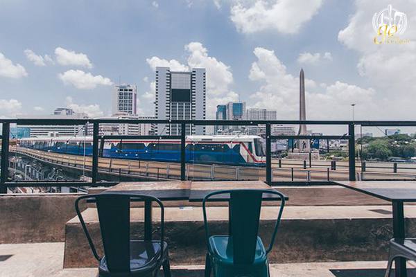 ส่วนอีกโซนของตัวคาเฟ่ “Peak-a-Boo” ก็เป็นจุดที่ลูกค้าหลายคนชื่นชอบกันมาก เพราะมีมุมระเบียงให้ลูกค้าสามารถนั่งชมรถไฟฟ้าที่เคลื่อนตัวผ่านได้อย่างชัดเจนและเห็นวิวตึกสูงระฟ้าของกรุงเทพมหานครในย่านใกล้เคียงได้แบบ Open – Air เลย หากเป็นในช่วงกลางคืนที่ร้านนี้ก็จะมีวงดนตรีมาเล่นด้วย ได้บรรยากาศบาร์ชิลล์ ๆ ยามค่ำคืนแบบยุค 80’s ในโทนสีเขียววินเทจไปอีก
