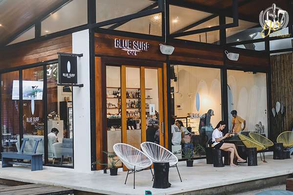 “Blue Surf Café” ตัวคาเฟ่ถูกออกแบบเป็นบ้านขนาดใหญ่ด้วยการสร้างจากไม้เป็นหลักทำให้มีความคันทรี่ แต่ก็ตกแต่งด้วยกระจกใสและเครื่องเรือนกับเฟอร์นิเจอร์สีสันสดยุคใหม่ทำให้มีความผสมผสานกันอย่างลงตัว ดูชิค ๆ ซึ่งบริเวณคาเฟ่ได้มีการเชื่อมระเบียงไม้ในส่วนต่าง ๆ ให้มีลานนั่งรับประทานอาหารและจิบเครื่องดื่มริมทะเลอย่างสโลว์ไลฟ์ มีหมอนอิงนุ่ม ๆ กับอีกโซนหนึ่งจะเป็นบ้านยุคสมัยใหม่ทั่วไปที่มีสีขาวโดดเด่นใต้ร่มไม้ใหญ่ มีห้องให้นั่งรับประทานอาหารเพียงพอต่อจำนวนคนที่มา ใครที่ชอบดื่มด่ำกับวิวทะเลมุมสูงหน่อยสามารถขึ้นไปนั่งรับประทานอาหารที่บ้านหลังสีขาวได้ ภายนอกคุณยังสามารถถ่ายรูปคู่เซิร์ฟบอร์ดหลากหลายสีสันที่เป็นสัญลักษณ์หลักของร้านได้ด้วย
