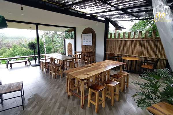 ส่วนภายในตัวบ้านฮักกะปงคาเฟ่ก็จะเป็นโซนที่ให้นักท่องเที่ยวสั่งเครื่องดื่มกับของหวาน มีการตกแต่งด้วยกระถางต้นไม้และโคมไฟโมเดิร์นเรียบง่าย และมีหน้าต่างวงกลมที่สามารถถ่ายรูปสภาพแวดล้อมภายนอกเป็นกรอบฉากหน้าได้อย่างมีศิลปะ ที่นั่งภายในร้านมีไม่เยอะมาก ส่วนใหญ่จะให้ลูกค้ารับเครื่องดื่มและเดินบนสะพานชมป่าไม้และวิวมุมสูงจากเนินเขาเพื่อชมความงดงามของสภาพแวดล้อมเหมือนเป็นสถานที่ท่องเที่ยวมากกว่าจะให้มานั่งพักดื่มเครื่องดื่มเท่านั้น แต่รับรองว่าแม้จะเดินดูธรรมชาติก็ทำให้คุณหายเหนื่อยได้อย่างแน่นอน เพราะวิวคาเฟ่นี้สวยมากจริง ๆ