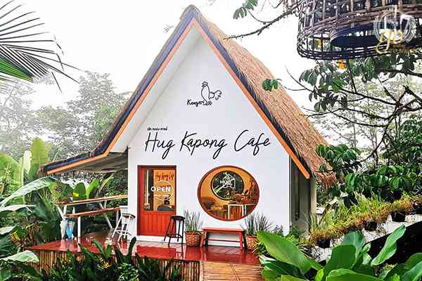 “ฮักกะปงคาเฟ่” ถูกออกแบบมาให้เป็นบ้านขนาดกะทัดรัดหลังคาทรงแหลมจั่วประดับแฝกโดดเด่นในสายตาของนักเดินทางที่ขับรถขึ้นเขามาจนนักท่องเที่ยวหลายคนต้องจอดรถแวะพักผ่อนที่คาเฟ่นี้ทั้งนั้น โดยจากริมถนนจะมีสะพานไม้ให้ผู้คนเดินชมความงดงามของป่าไม้อำเภอกะปงรอบด้านเพื่อเชื่อมมาสู่ตัวบ้านฮักกะปงคาเฟ่ที่ตั้งตระหง่านอยู่บนเนินเขาสูงที่โอบล้อมด้วยต้นไม้สีเขียวแก่นานาพรรณที่ให้ร่มเงาราวกับเป็นบ้านกลางป่า ด้านข้างจนถึงด้านหลังคาเฟ่จะมีลำธารสวย ๆ เสริมชีวิตชีวาให้คนที่มานั่งบริเวณลานระเบียงจิบเครื่องดื่มได้อย่างเพลิดเพลิน และหากไปวันดี ๆ ที่ฝนตกหรือช่วงเช้าที่อากาศหนาวก็จะได้เห็นทะเลหมอกที่ลอยอยู่ด้านหลังคาเฟ่ด้วย เป็นทิวทัศน์ช่วงเวลาสำคัญที่ถูกบอกต่อกันมาว่าต้องไม่พลาดถ่ายรูปเก็บไว้